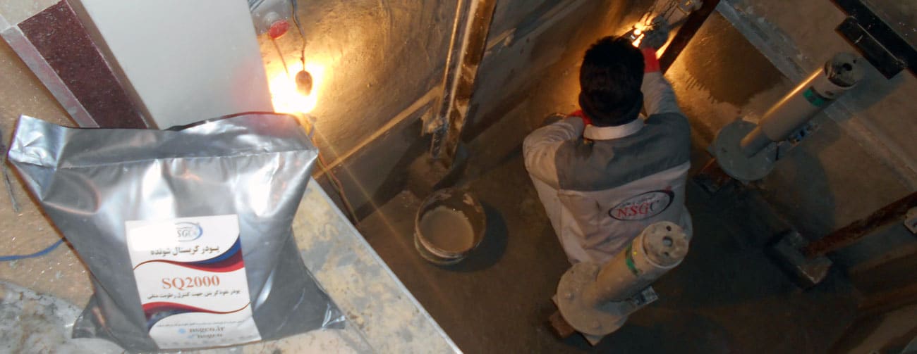 A powder with waterproofing properties that is applied as a coating on cementitious surfaces by creating cement crystals in structures experiencing negative moisture in an integral manner. This powder, based on cement and mineral fillers, is produced using nanotechnology. After mixing with water, it penetrates concrete or cementitious surfaces and forms crystals resistant to moisture ingress through a chemical reaction in the pores and voids of the concrete. This product is not merely a surface coating; rather, due to the reaction of its components with moisture and water, it creates a compact and integral structure with the concrete, serving as one of the auxiliary systems in the waterproofing and protection of concrete structures. The SQ2000 crystalline powder is highly resistant to CO2 gas and negative water pressure, and it is environmentally friendly.